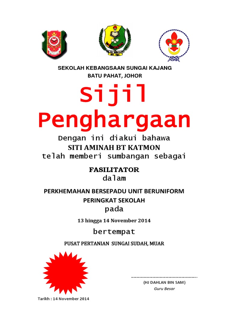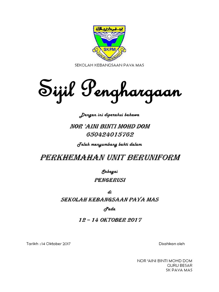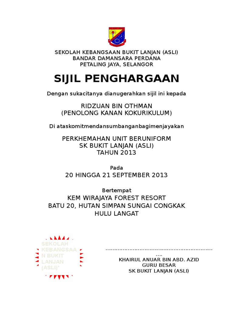 Untuk makluman template sijil ini adalah berformat pptx Microsoft Power Point. Template sijil penghargaan word contoh sijil penghargaan dan boleh diedit perkongsian ini sangat bagus. May 02 2014 contoh sijil penyertaan sijil penyertaan perkhemahan bersepadu peringkat sekolah sk kampong aur adzie normien al awang 011231060971 dengan sukacitanya dimaklumkan bahawa pelajar tersebut telah menyertai program perkhemahan bersepadu peringkat sekolah yang diadakan pada 18hb oktober hingga 19 oktober 2013 pihak sekolah.