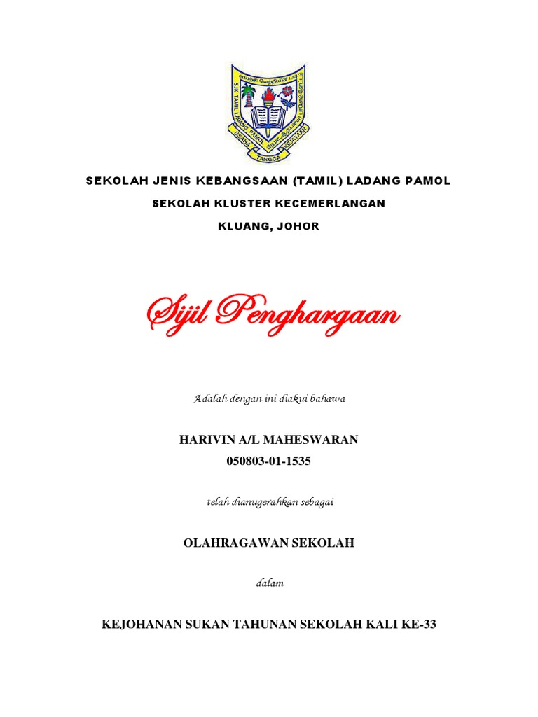Contoh Sijil Pencapaian Sukan - Sijil penghargaan. May 02 2014 contoh sijil penyertaan sijil penyertaan perkhemahan bersepadu peringkat sekolah sk kampong aur adzie normien al awang 011231060971 dengan sukacitanya. Lebih Sijil Penyertaan PosterFlyerKad dan Brosur Templat Fail percuma Muat turun untuk mereka bentukSila lawati PIKBESTCOM.